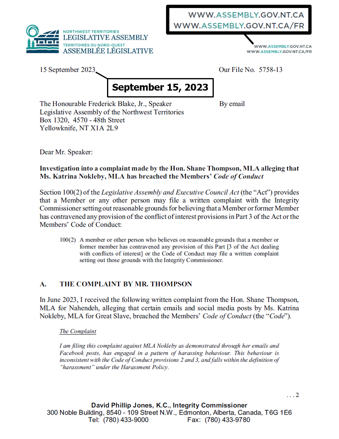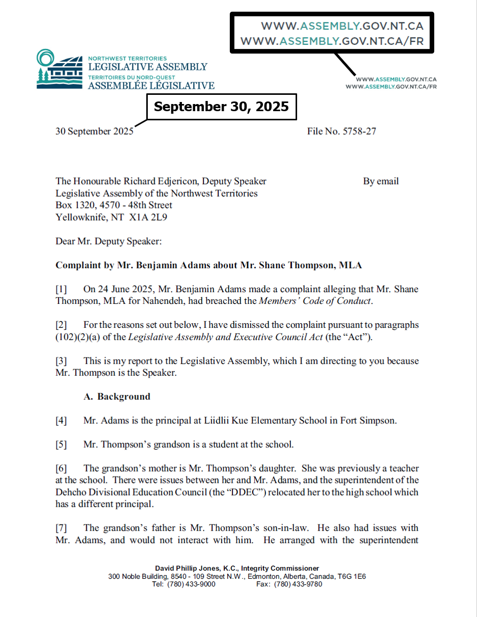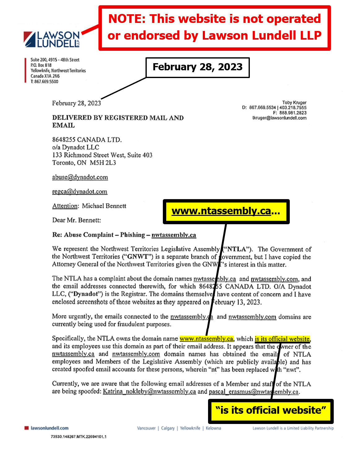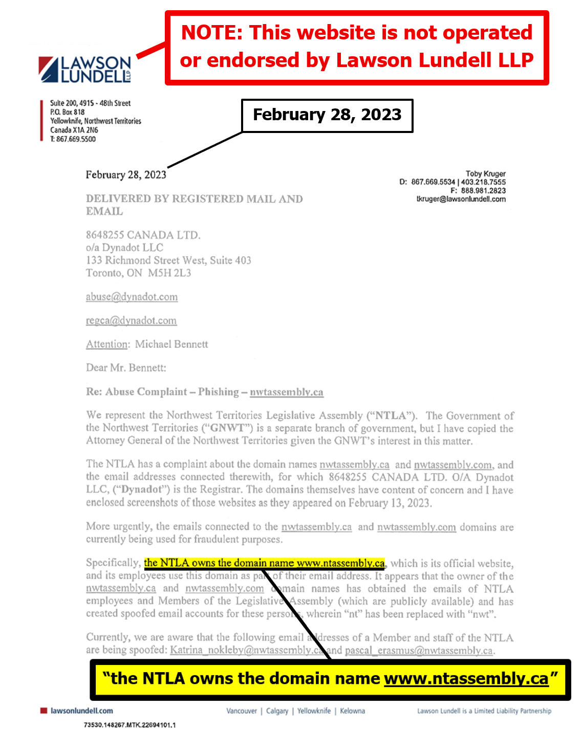 "the NTLA owns the domain name www.ntassembly.ca" is FALSE: