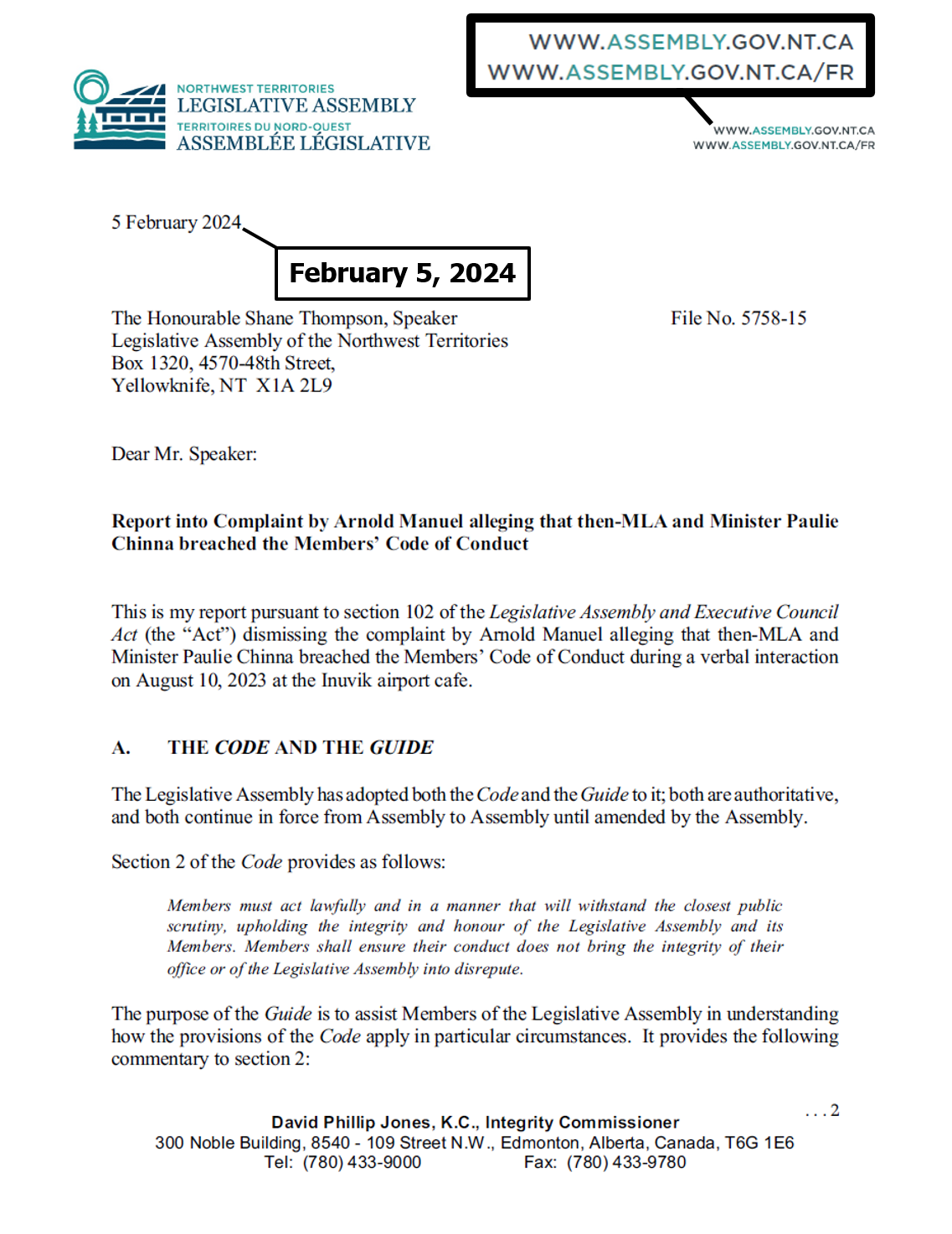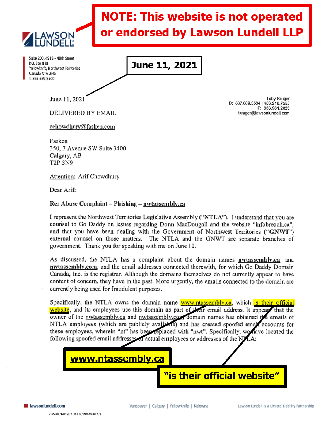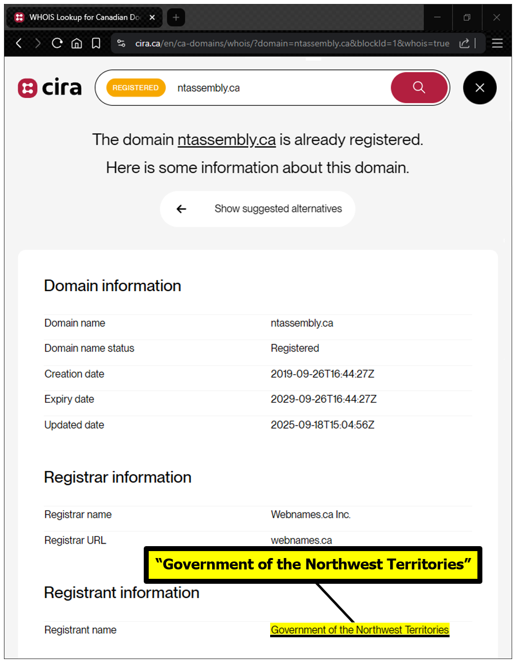 "the NTLA owns the domain name www.ntassembly.ca" is FALSE: