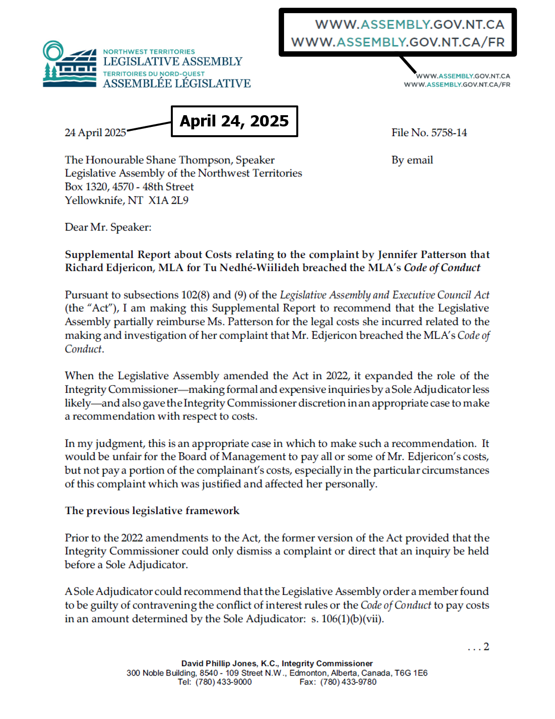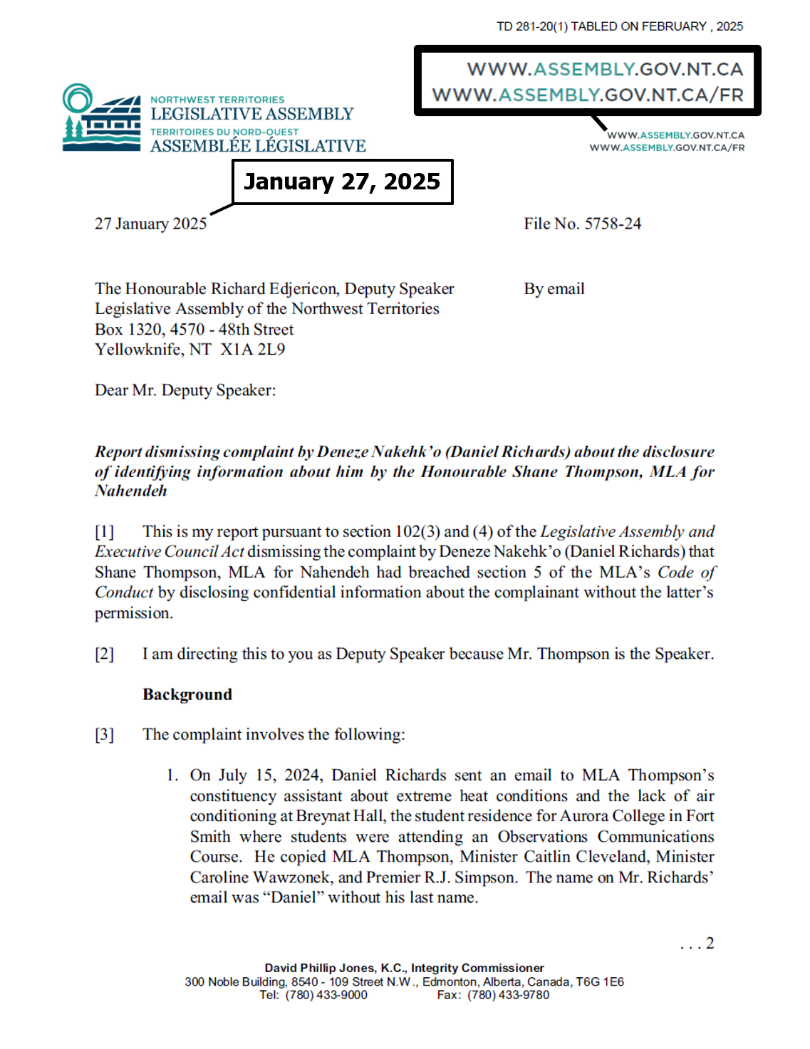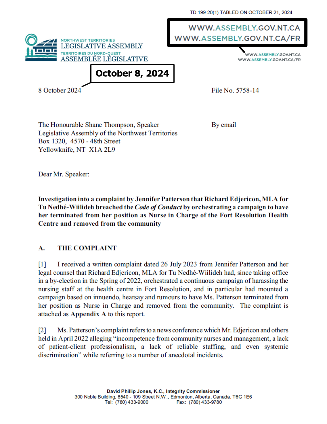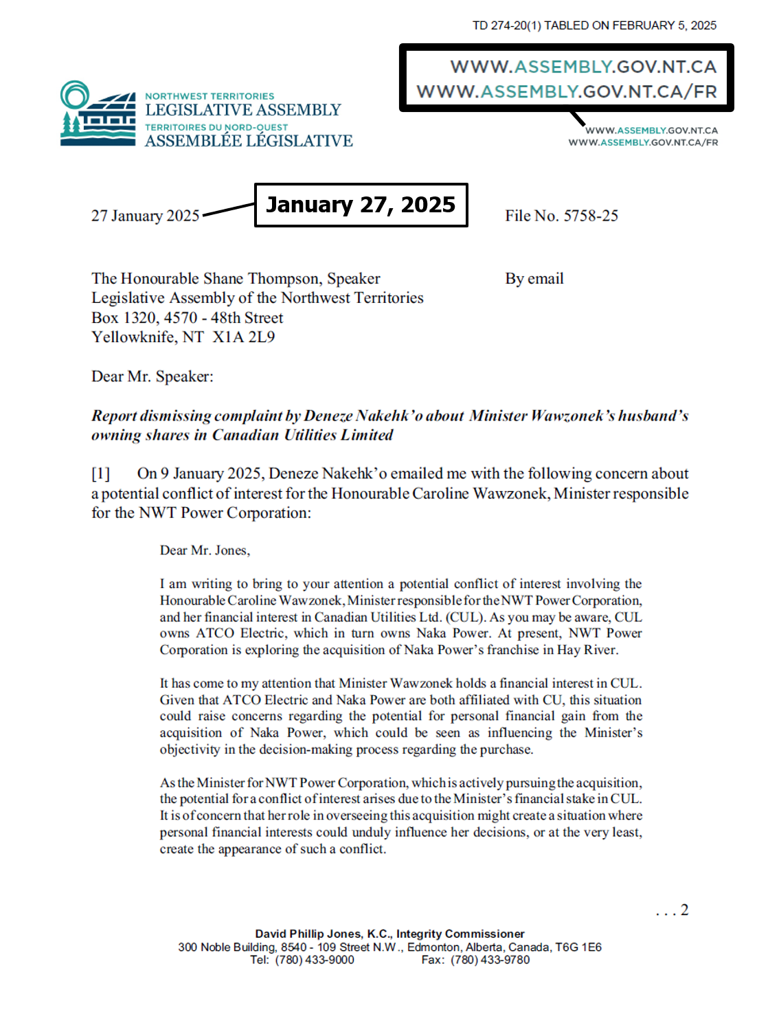 "the NTLA owns the domain name www.ntassembly.ca" is FALSE: